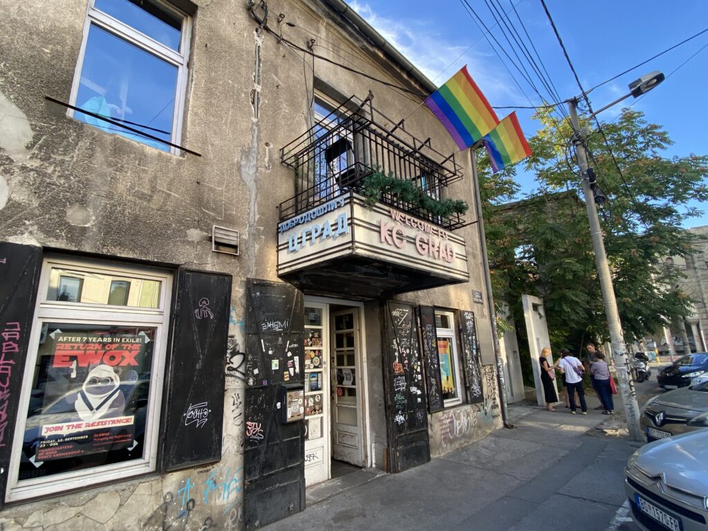 Les militants se sont installés cette année près des quais de la Sava, dans un centre culturel branché de Belgrade. La façade décrépite du repaire est recouverte par les couleurs vives et accueillantes des drapeaux LGBT.