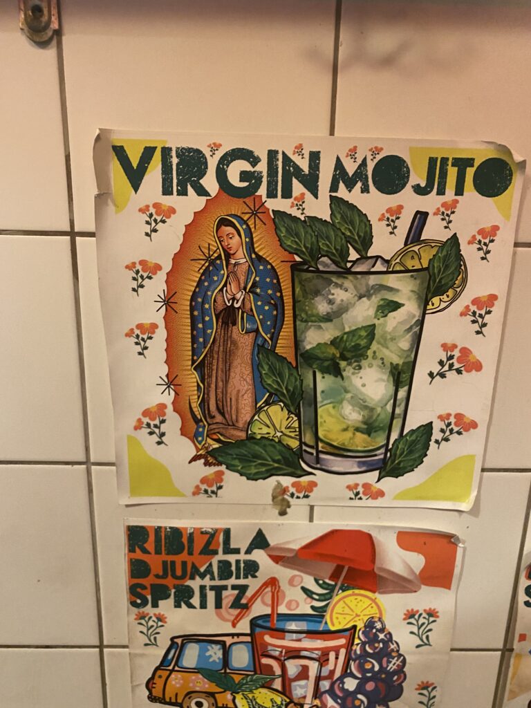 À l’intérieur, nous retrouvons un bar « underground » des plus belgradois : murs esquintés mélangeant un crépi fragile et des briques rouges, des poteaux en béton recouverts de dessins façon street art, et les carreaux de faïence du bar sont recouverts d’affiches colorées. C’est dans ce décor que se sont donnés rendez-vous les militants pour lutter, rire et préparer la Pride.