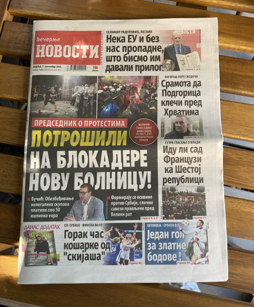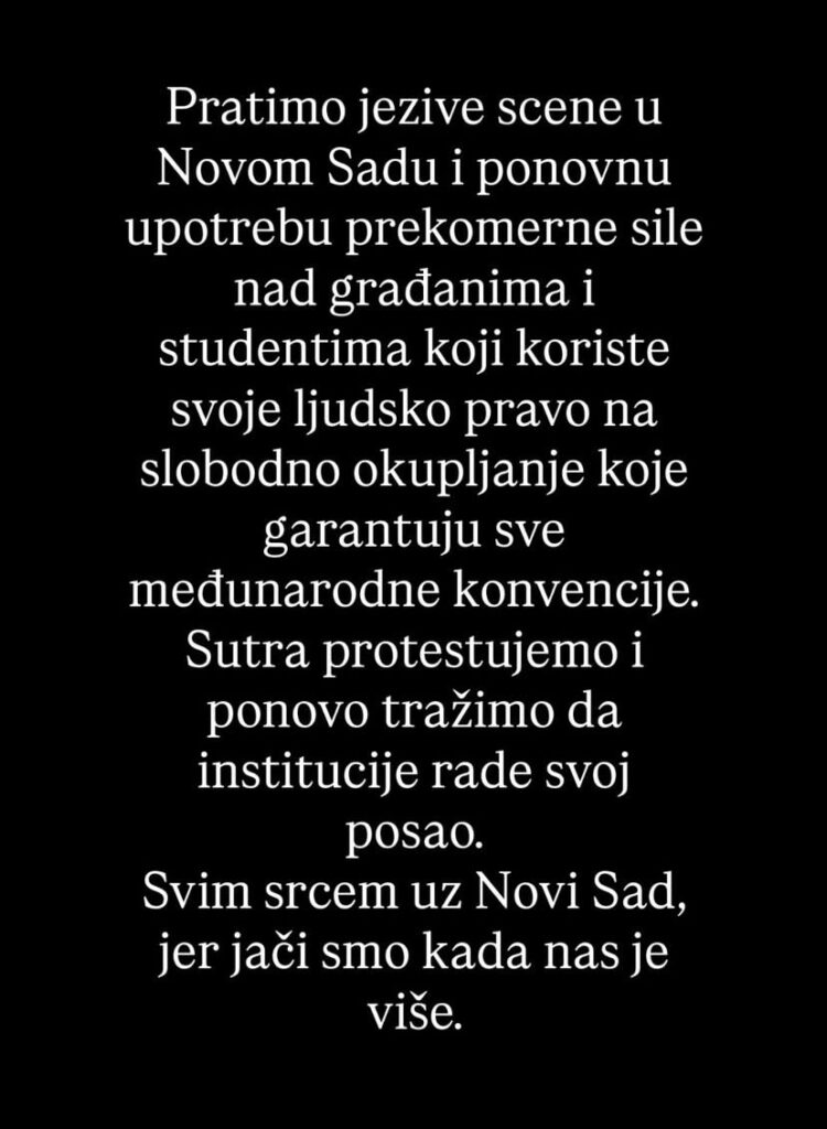 L’anxiété est cependant montée d’un cran pendant le spectacle, avec l’arrivée vers 23h des images de violences policières à Novi Sad (grande ville du nord de la Serbie). Ce soir-là, 20 000 manifestants s’étaient réunis au centre-ville pour manifester contre le gouvernement Vučić, accusé par la jeunesse serbe de corruption et de négligence après l’effondrement du toit de la gare de Novi Sad le 1er novembre 2024.