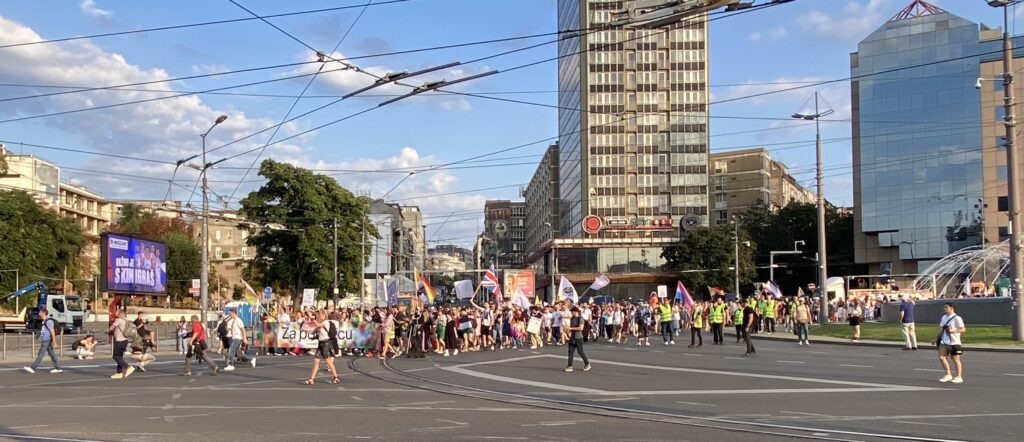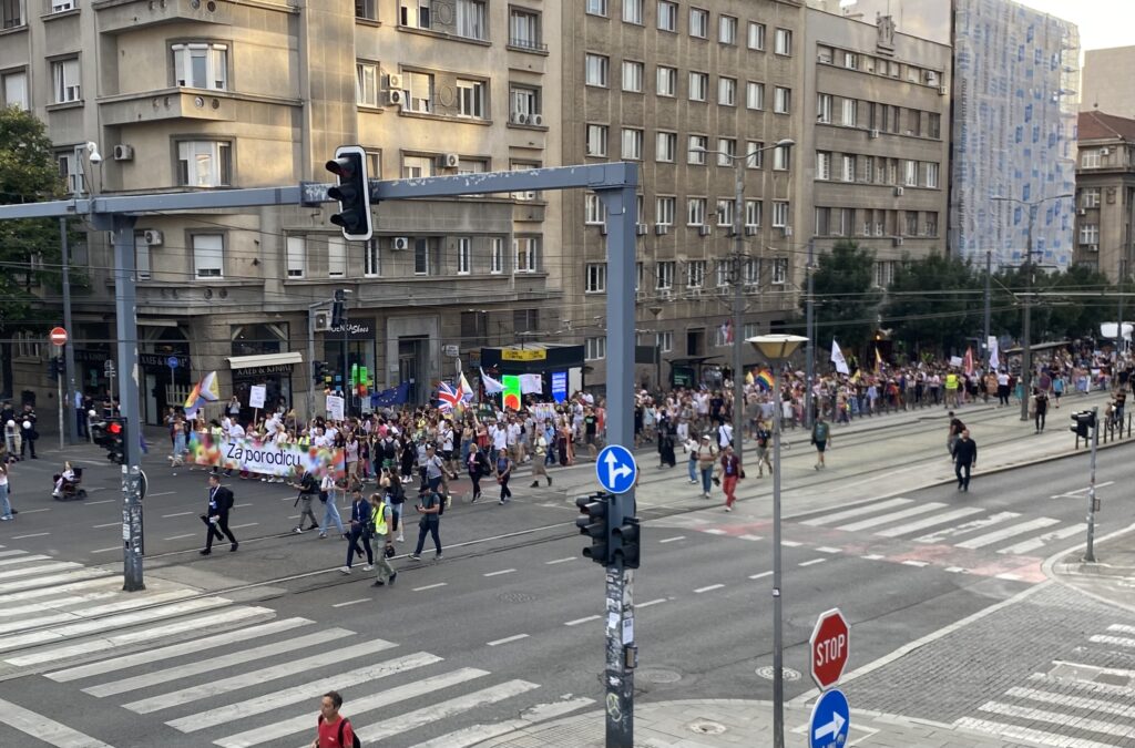 Après une heure de réunion dans le parc, la marche s’est élancée à 17h dans les artères désertiques de Belgrade ; la police a bloqué l’ensemble du tracé, en positionnant des garnisons de CRS à chaque intersection de rue. Les 3000 manifestants ont avancé en cortège resserré pour faciliter la sécurité. En première ligne, on pouvait voir les responsables de la marche tenant une banderole « pour la famille ». Juste derrière eux, plusieurs Drags Queens sont installées à l’arrière d’un camion, aménagé pour l’occasion en char de Pride. Elles lancent les chants de contestations et diffuse de la musique.